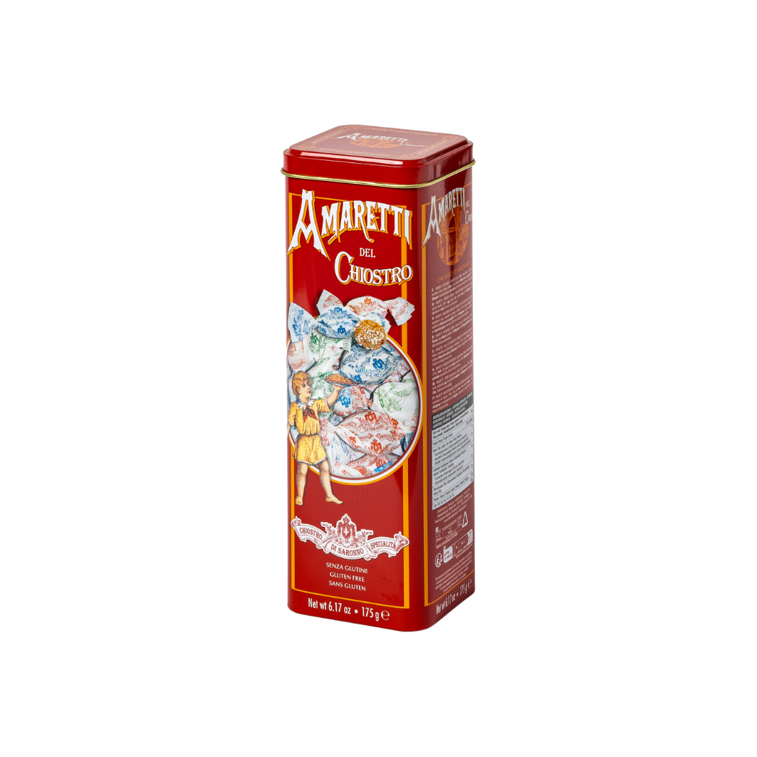 An elegant tower tin filled with classic crunchy amaretti, known for their light texture and signature bittersweet almond notes.