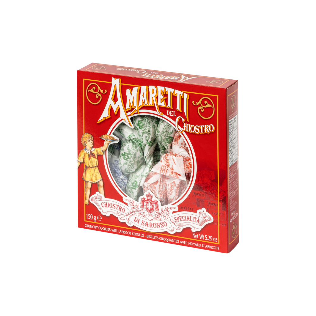 Classic crunchy amaretti with a light, crisp texture and signature bittersweet flavor. Presented in a window box, these timeless Italian biscuits from Chiostro are perfect for gifting or serving with espresso.