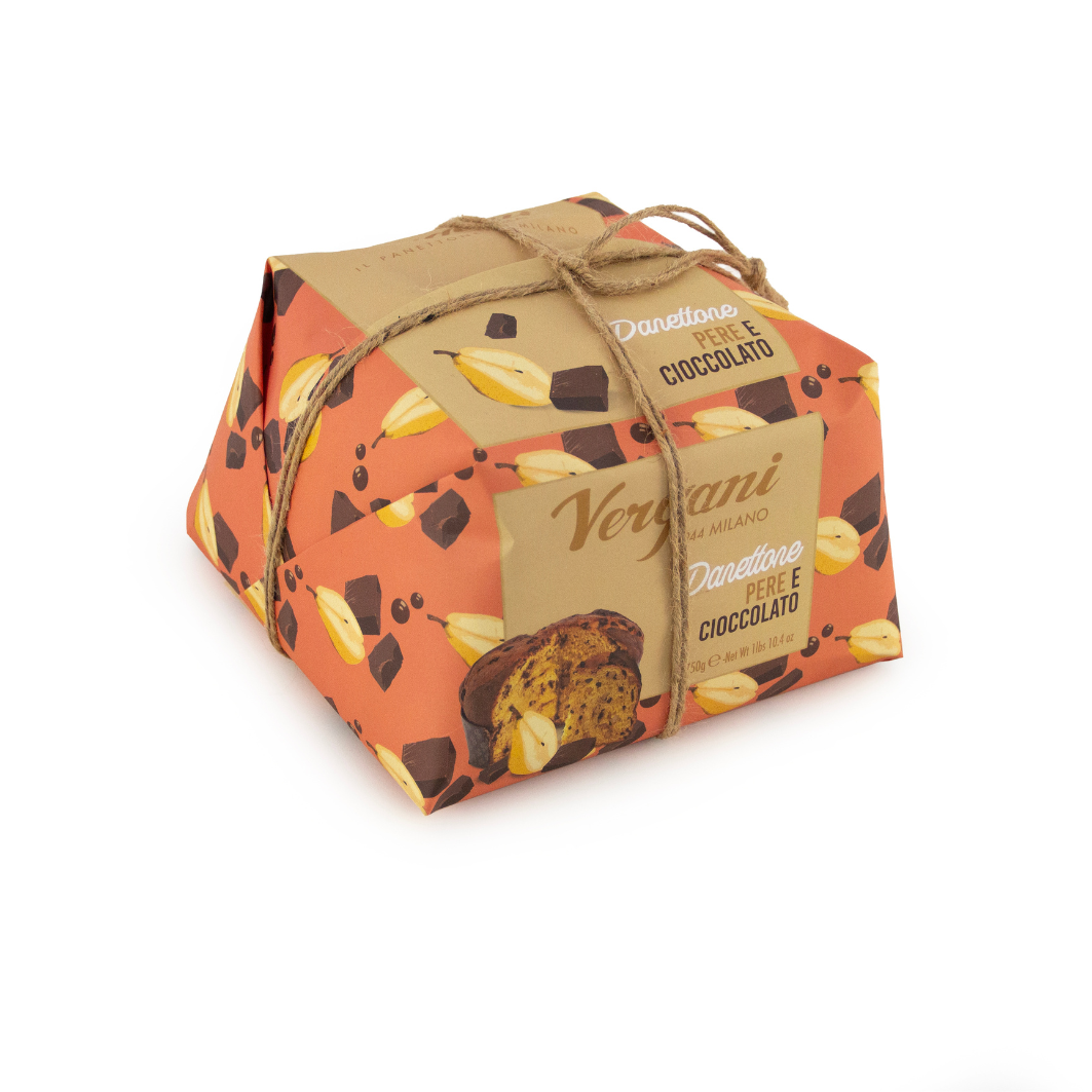 A decadent twist on the Milanese classic: naturally leavened Panettone with candied pear cubes and rich dark chocolate drops. Soft, aromatic, and perfect for holiday indulgence.